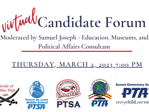 The first candidate forum for the 2023 Coral Gables Municipal Election is set for Thursday, March 2nd at 7:00PM. The Virtual Forum is being hosted by Friends of Gables High, Ponce de Leon Middle School PTSA, Coral Gables Preparatory Academy…