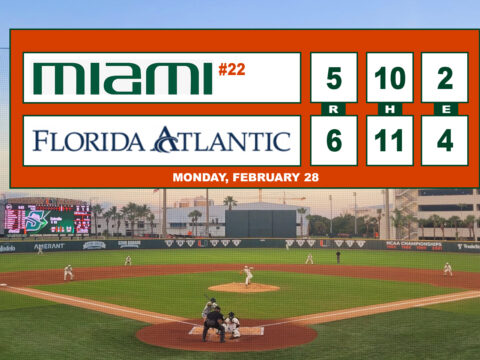 The seven-game winning streak came crashing down on the playing field at Boca. FAU with a late rally in the 7th retakes the lead and holds off the Canes with BL in the 8th to get the win. For the…