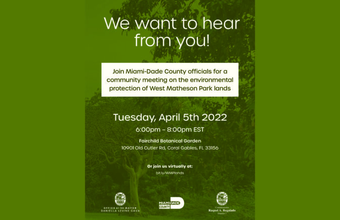 “Please join the Office of the Mayor, Commissioner Raquel Regalado, and Miami-Dade County Officials for a presentation on the latest environmental findings for West Matheson Hammock Park.