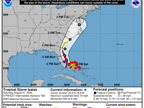 000 WTNT34 KNHC 020254 TCPAT4 BULLETIN Tropical Storm Isaias Advisory Number 20 NWS National Hurricane Center Miami FL AL092020 1100 PM EDT Sat Aug 01 2020 …ISAIAS CONTINUES TO SLOWLY APPROACH THE SOUTHEAST FLORIDA COAST… SUMMARY OF 1100 PM EDT…0300…