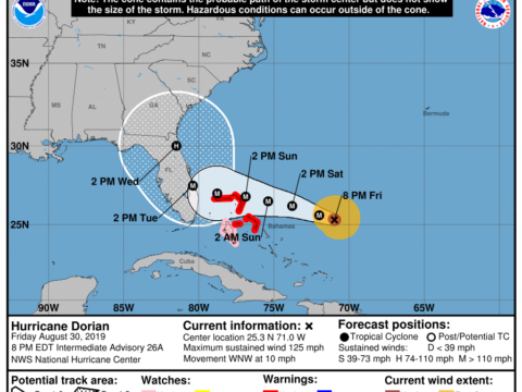 8-30-2019 – 8:00PM Intermediate Advisory Hurricane Dorian continues on a WNW track. The forecast track has not changed since the 5:00PM Advisory. No watches or warnings have been issued for Florida yet, but we could expect that later tonight or…