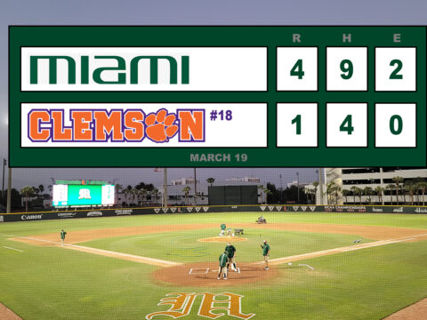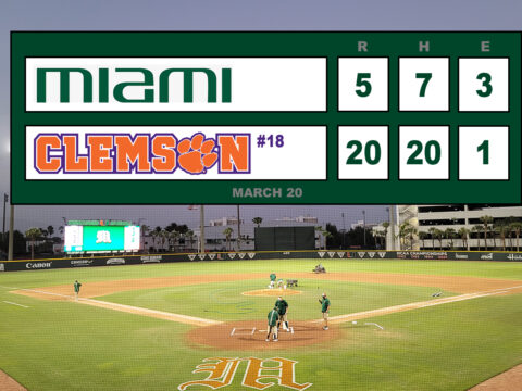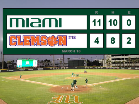 Miami suffering a midweek loss to UCF bounced back taking advantage of Clemson’s pitching staff’s lack of command and control in the early innings to take a commanding 8-0 lead through 4. They did it with small ball and consistently…
