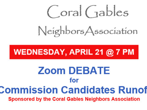 On Wednesday, April 21st, the Coral Gables Neighbors Association, Gables Good Government, Historic Preservation Association of Coral Gables, Ponce Neighbors Association and Urban Core Community Coalition, Inc. will hold a debate with the four remaining Commission candidates for the April…