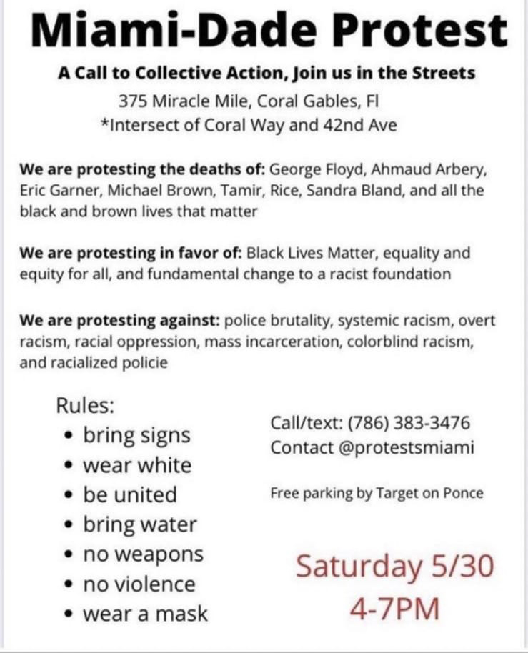 I find this to be out of place at present. With Covid19, distancing and face covering, this will only serve to spike numbers, we do not need a surge at present. Like all protests, we might see violence at a time when places are starting to open. Bad idea whoever in Coral Gables is allowing this to take place during the Covid19 pandemic. Don’t let your guard down, it’s not the time. Lord help us all.